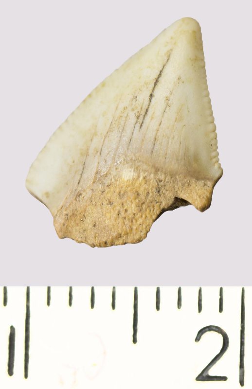 Зуб (фрагмент). Акула. Anacorax kaupi (Agassiz, 1843). Классификация: Хордовые Chordata, Позвоночные Vertebrata, Хрящевые рыбы Chondrichthyes, Пластиножаберные Elasmobranchii