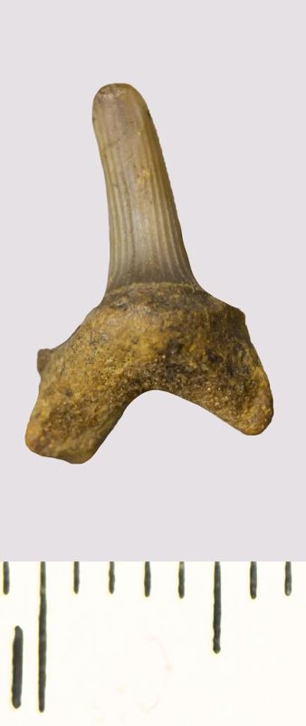 Зуб. Акула. Scapanorhynchus rhaphiodon Agassiz, 1843. Классификация: Хордовые Chordata, Позвоночные Vertebrata, Хрящевые рыбы Chondrichthyes, Пластиножаберные Elasmobranchii