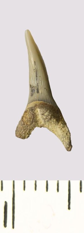 Зуб. Акула. Scapanorhynchus rhaphiodon Agassiz, 1843. Классификация: Хордовые Chordata, Позвоночные Vertebrata, Хрящевые рыбы Chondrichthyes, Пластиножаберные Elasmobranchii