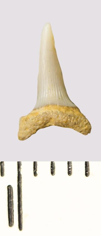 Зуб. Акула. Scapanorhynchus rhaphiodon Agassiz, 1843. Классификация: Хордовые Chordata, Позвоночные Vertebrata, Хрящевые рыбы Chondrichthyes, Пластиножаберные Elasmobranchii