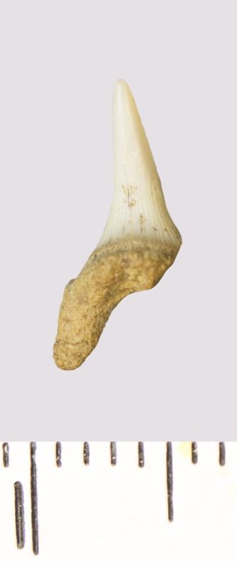 Зуб. Акула. Scapanorhynchus rhaphiodon Agassiz, 1843. Классификация: Хордовые Chordata, Позвоночные Vertebrata, Хрящевые рыбы Chondrichthyes, Пластиножаберные Elasmobranchii