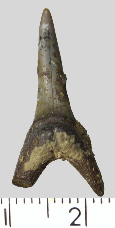 Зуб. Акула. Scapanorhynchus sp. Классификация: Хордовые Chordata, Позвоночные Vertebrata, Хрящевые рыбы Chondrichthyes, Пластиножаберные Elasmobranchii