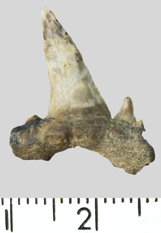 Зуб. Акула. Scapanorhynchus sp. Классификация: Хордовые Chordata, Позвоночные Vertebrata, Хрящевые рыбы Chondrichthyes, Пластиножаберные Elasmobranchii