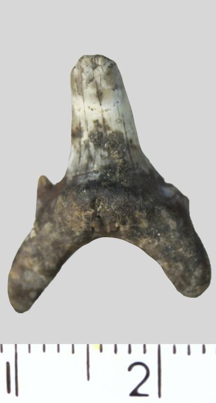 Зуб. Акула. Scapanorhynchus sp. Классификация: Хордовые Chordata, Позвоночные Vertebrata, Хрящевые рыбы Chondrichthyes, Пластиножаберные Elasmobranchii