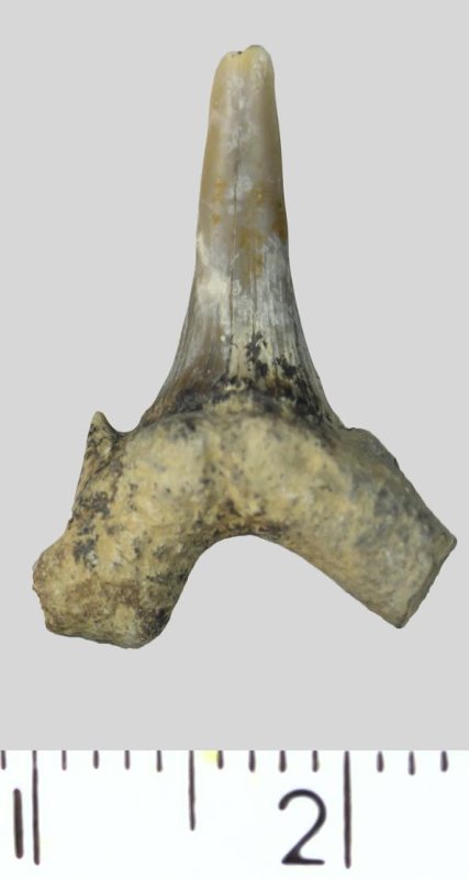 Зуб. Акула. Scapanorhynchus sp. Классификация: Хордовые Chordata, Позвоночные Vertebrata, Хрящевые рыбы Chondrichthyes, Пластиножаберные Elasmobranchii