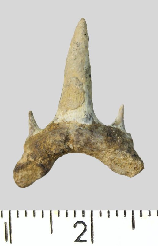 Зуб. Акула. Scapanorhynchus sp. Классификация: Хордовые Chordata, Позвоночные Vertebrata, Хрящевые рыбы Chondrichthyes, Пластиножаберные Elasmobranchii
