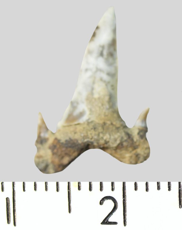 Зуб. Акула. Scapanorhynchus sp. Классификация: Хордовые Chordata, Позвоночные Vertebrata, Хрящевые рыбы Chondrichthyes, Пластиножаберные Elasmobranchii