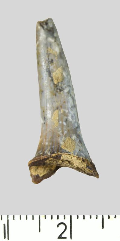 Зуб (фрагмент). Акула. Hispidaspis sp. Классификация: Хордовые Chordata, Позвоночные Vertebrata, Хрящевые рыбы Chondrichthyes, Пластиножаберные Elasmobranchii