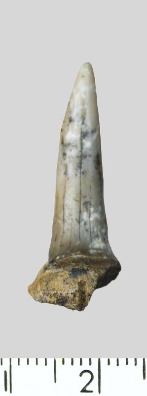 Зуб (фрагмент). Акула. Hispidaspis sp. Классификация: Хордовые Chordata, Позвоночные Vertebrata, Хрящевые рыбы Chondrichthyes, Пластиножаберные Elasmobranchii