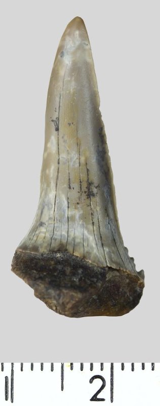 Зуб (фрагмент). Акула. Hispidaspis sp. Классификация: Хордовые Chordata, Позвоночные Vertebrata, Хрящевые рыбы Chondrichthyes, Пластиножаберные Elasmobranchii