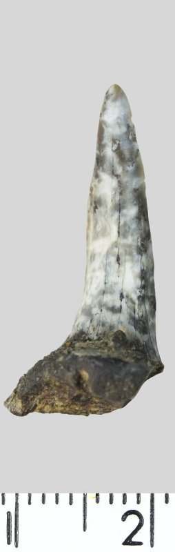 Зуб (фрагмент). Акула. Hispidaspis sp. Классификация: Хордовые Chordata, Позвоночные Vertebrata, Хрящевые рыбы Chondrichthyes, Пластиножаберные Elasmobranchii