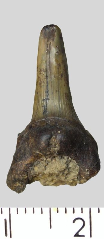 Зуб. Акула. Scapanorhynchus sp. Классификация: Хордовые Chordata, Позвоночные Vertebrata, Хрящевые рыбы Chondrichthyes, Пластиножаберные Elasmobranchii