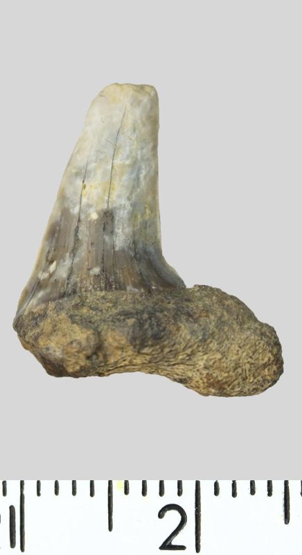 Зуб. Акула. Scapanorhynchus sp. Классификация: Хордовые Chordata, Позвоночные Vertebrata, Хрящевые рыбы Chondrichthyes, Пластиножаберные Elasmobranchii