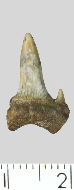 Зуб. Акула. Scapanorhynchus sp. Классификация: Хордовые Chordata, Позвоночные Vertebrata, Хрящевые рыбы Chondrichthyes, Пластиножаберные Elasmobranchii