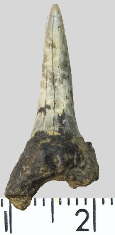 Зуб. Акула. Scapanorhynchus sp. Классификация: Хордовые Chordata, Позвоночные Vertebrata, Хрящевые рыбы Chondrichthyes, Пластиножаберные Elasmobranchii