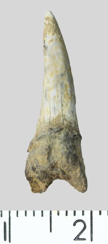 Зуб. Акула. Scapanorhynchus sp. Классификация: Хордовые Chordata, Позвоночные Vertebrata, Хрящевые рыбы Chondrichthyes, Пластиножаберные Elasmobranchii