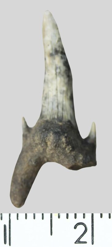 Зуб. Акула. Scapanorhynchus sp. Классификация: Хордовые Chordata, Позвоночные Vertebrata, Хрящевые рыбы Chondrichthyes, Пластиножаберные Elasmobranchii