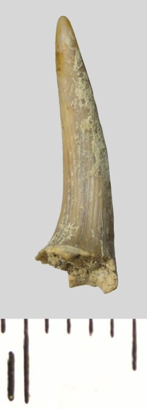Зуб (фрагмент). Акула. Scapanorhynchus rhaphiodon Agassiz, 1843. Классификация: Хордовые Chordata, Позвоночные Vertebrata, Хрящевые рыбы Chondrichthyes, Пластиножаберные Elasmobranchii