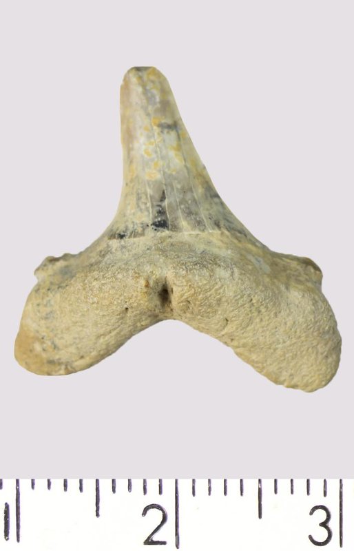 Зуб. Акула. Scapanorhynchus gigas Woodward, 1889. Классификация: Хордовые Chordata, Позвоночные Vertebrata, Хрящевые рыбы Chondrichthyes, Пластиножаберные Elasmobranchii
