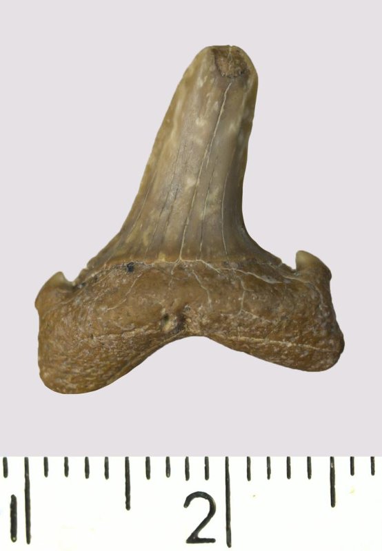 Зуб. Акула. Scapanorhynchus gigas Woodward, 1889. Классификация: Хордовые Chordata, Позвоночные Vertebrata, Хрящевые рыбы Chondrichthyes, Пластиножаберные Elasmobranchii