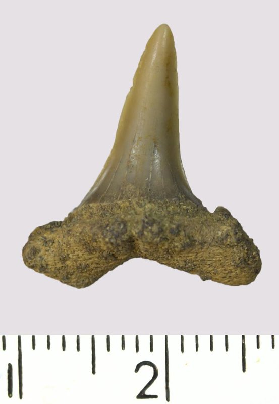 Зуб. Акула. Scapanorhynchus gigas Woodward, 1889. Классификация: Хордовые Chordata, Позвоночные Vertebrata, Хрящевые рыбы Chondrichthyes, Пластиножаберные Elasmobranchii