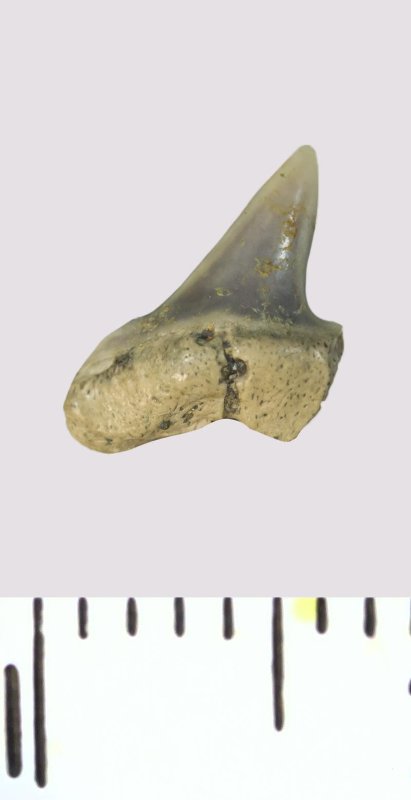 Зуб. Акула. Lamniformes gen. et sp. indet. Классификация: Хордовые Chordata, Позвоночные Vertebrata, Хрящевые рыбы Chondrichthyes, Пластиножаберные Elasmobranchii