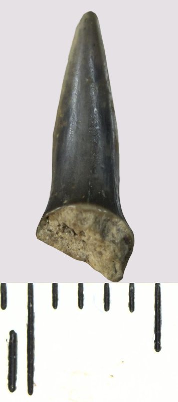 Зуб (фрагмент). Акула. Eostriatolamia venusta Leriche, 1906. Классификация: Хордовые Chordata, Позвоночные Vertebrata, Хрящевые рыбы Chondrichthyes, Пластиножаберные Elasmobranchii