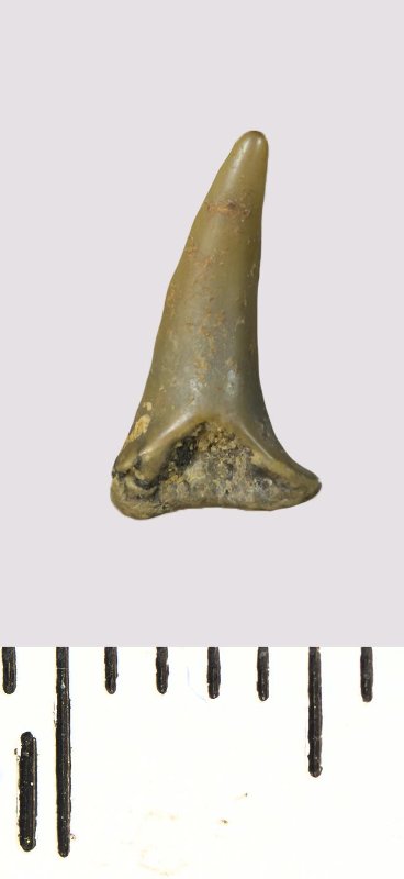 Зуб (фрагмент). Акула. Eostriatolamia venusta Leriche, 1906. Классификация: Хордовые Chordata, Позвоночные Vertebrata, Хрящевые рыбы Chondrichthyes, Пластиножаберные Elasmobranchii