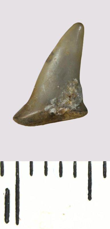 Зуб (фрагмент). Акула. Eostriatolamia venusta Leriche, 1906. Классификация: Хордовые Chordata, Позвоночные Vertebrata, Хрящевые рыбы Chondrichthyes, Пластиножаберные Elasmobranchii