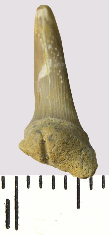 Зуб (фрагмент). Акула. Scapanorhynchus rhaphiodon Agassiz, 1843. Классификация: Хордовые Chordata, Позвоночные Vertebrata, Хрящевые рыбы Chondrichthyes, Пластиножаберные Elasmobranchii