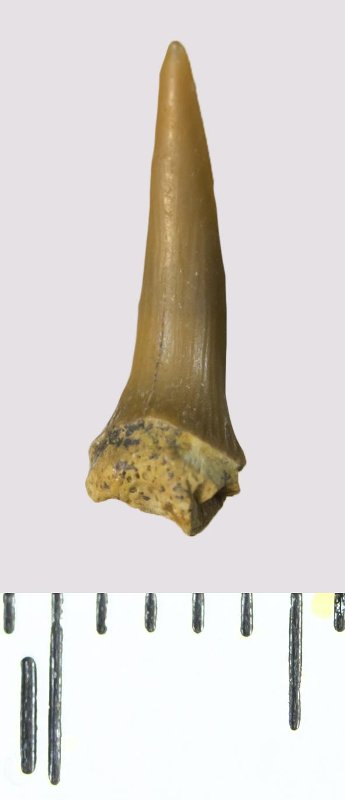 Зуб (фрагмент). Акула. Scapanorhynchus rhaphiodon Agassiz, 1843. Классификация: Хордовые Chordata, Позвоночные Vertebrata, Хрящевые рыбы Chondrichthyes, Пластиножаберные Elasmobranchii