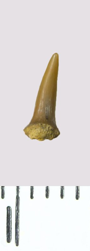 Зуб (фрагмент). Акула. Scapanorhynchus rhaphiodon Agassiz, 1843. Классификация: Хордовые Chordata, Позвоночные Vertebrata, Хрящевые рыбы Chondrichthyes, Пластиножаберные Elasmobranchii