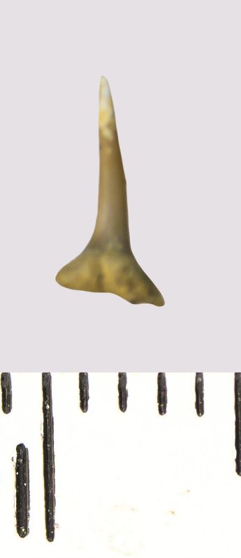 Зуб. Акула. Scapanorhynchus rhaphiodon Agassiz, 1843. Классификация: Хордовые Chordata, Позвоночные Vertebrata, Хрящевые рыбы Chondrichthyes, Пластиножаберные Elasmobranchii