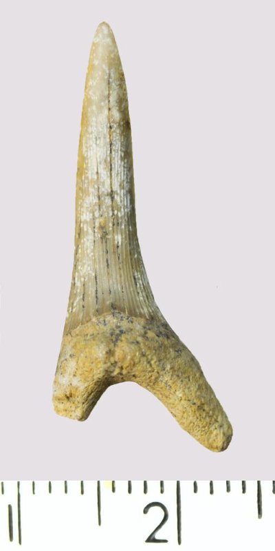 Зуб. Акула. Scapanorhynchus rhaphiodon Agassiz, 1843. Классификация: Хордовые Chordata, Позвоночные Vertebrata, Хрящевые рыбы Chondrichthyes, Пластиножаберные Elasmobranchii
