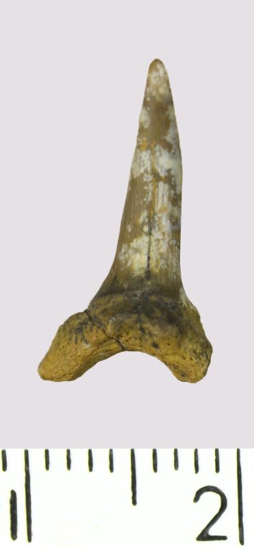 Зуб. Акула. Scapanorhynchus rhaphiodon Agassiz, 1843. Классификация: Хордовые Chordata, Позвоночные Vertebrata, Хрящевые рыбы Chondrichthyes, Пластиножаберные Elasmobranchii
