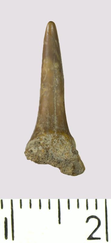 Зуб. Акула. Scapanorhynchus rhaphiodon Agassiz, 1843. Классификация: Хордовые Chordata, Позвоночные Vertebrata, Хрящевые рыбы Chondrichthyes, Пластиножаберные Elasmobranchii