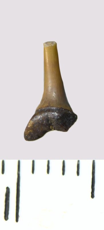 Зуб. Акула. Scapanorhynchus rhaphiodon Agassiz, 1843. Классификация: Хордовые Chordata, Позвоночные Vertebrata, Хрящевые рыбы Chondrichthyes, Пластиножаберные Elasmobranchii