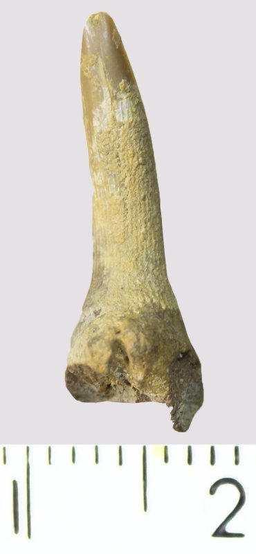 Зуб. Акула. Scapanorhynchus rhaphiodon Agassiz, 1843. Классификация: Хордовые Chordata, Позвоночные Vertebrata, Хрящевые рыбы Chondrichthyes, Пластиножаберные Elasmobranchii