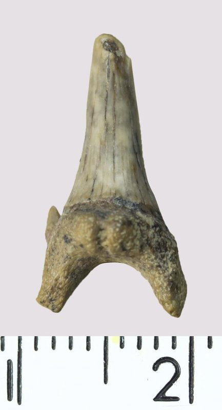 Зуб. Акула. Scapanorhynchus rhaphiodon Agassiz, 1843. Классификация: Хордовые Chordata, Позвоночные Vertebrata, Хрящевые рыбы Chondrichthyes, Пластиножаберные Elasmobranchii