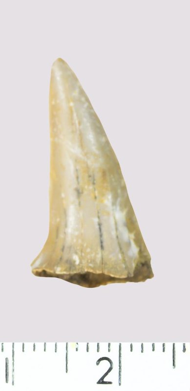 Зуб (фрагмент). Акула. Scapanorhynchus gigas Woodward, 1889. Классификация: Хордовые Chordata, Позвоночные Vertebrata, Хрящевые рыбы Chondrichthyes, Пластиножаберные Elasmobranchii