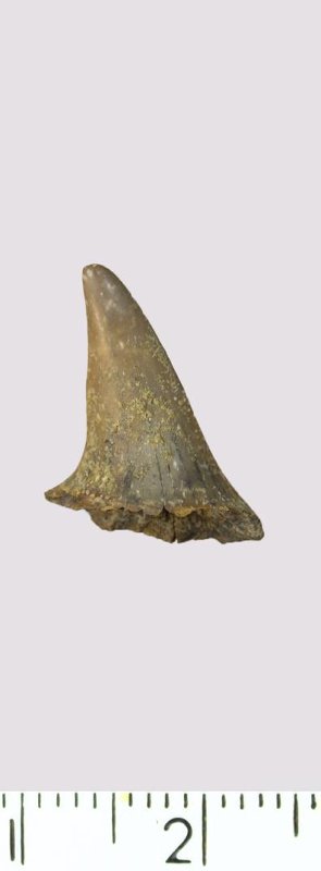 Зуб (фрагмент). Акула. Scapanorhynchus gigas Woodward, 1889. Классификация: Хордовые Chordata, Позвоночные Vertebrata, Хрящевые рыбы Chondrichthyes, Пластиножаберные Elasmobranchii