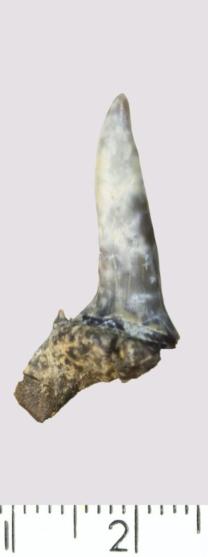 Зуб. Акула. Scapanorhynchus gigas Woodward, 1889. Классификация: Хордовые Chordata, Позвоночные Vertebrata, Хрящевые рыбы Chondrichthyes, Пластиножаберные Elasmobranchii