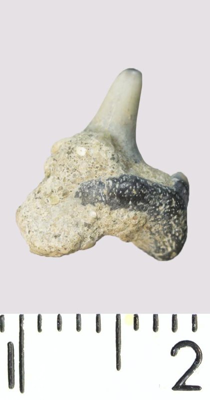 Зуб. Акула. Odontaspis macrorhiza (Cope) Leriche, 1902. Классификация: Хордовые Chordata, Позвоночные Vertebrata, Хрящевые рыбы Chondrichthyes, Пластиножаберные Elasmobranchii