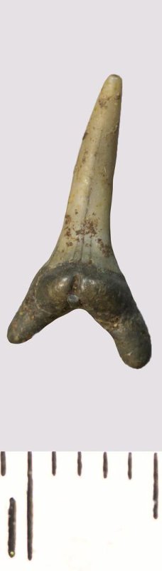 Зуб. Акула. Scapanorhynchus rhaphiodon Agassiz, 1843. Классификация: Хордовые Chordata, Позвоночные Vertebrata, Хрящевые рыбы Chondrichthyes, Пластиножаберные Elasmobranchii