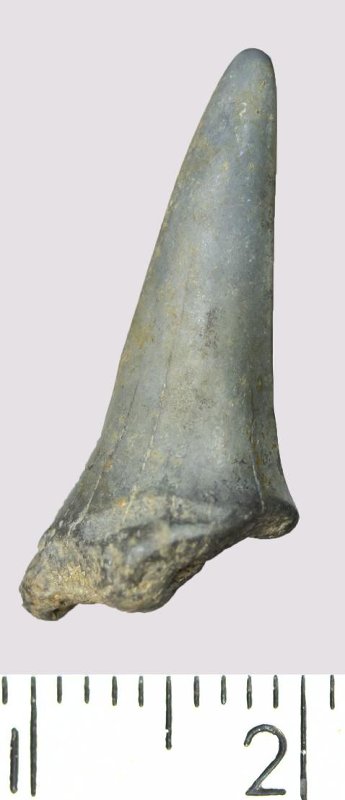Зуб (фрагмент). Акула. Scapanorhynchus gigas Woodward, 1889. Классификация: Хордовые Chordata, Позвоночные Vertebrata, Хрящевые рыбы Chondrichthyes, Пластиножаберные Elasmobranchii