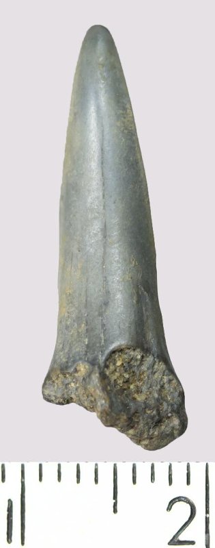 Зуб (фрагмент). Акула. Scapanorhynchus gigas Woodward, 1889. Классификация: Хордовые Chordata, Позвоночные Vertebrata, Хрящевые рыбы Chondrichthyes, Пластиножаберные Elasmobranchii