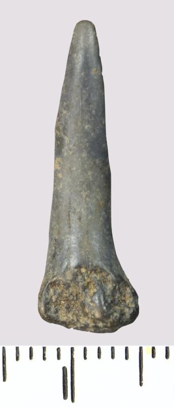 Зуб (фрагмент). Акула. Scapanorhynchus gigas Woodward, 1889. Классификация: Хордовые Chordata, Позвоночные Vertebrata, Хрящевые рыбы Chondrichthyes, Пластиножаберные Elasmobranchii
