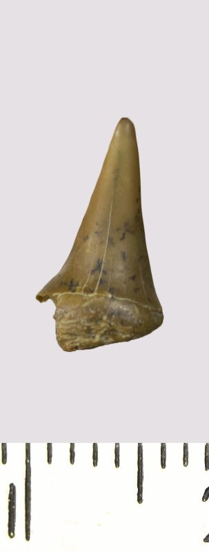 Зуб (фрагмент). Акула. Lamniformes gen. et sp. indet. Классификация: Хордовые Chordata, Позвоночные Vertebrata, Хрящевые рыбы Chondrichthyes, Пластиножаберные Elasmobranchii