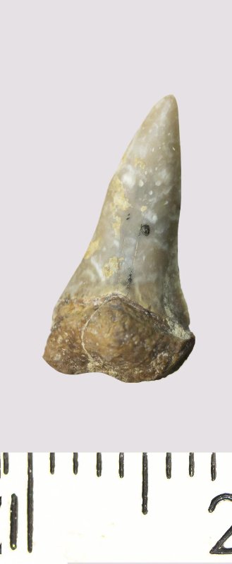 Зуб (фрагмент). Акула. Lamniformes gen. et sp. indet. Классификация: Хордовые Chordata, Позвоночные Vertebrata, Хрящевые рыбы Chondrichthyes, Пластиножаберные Elasmobranchii