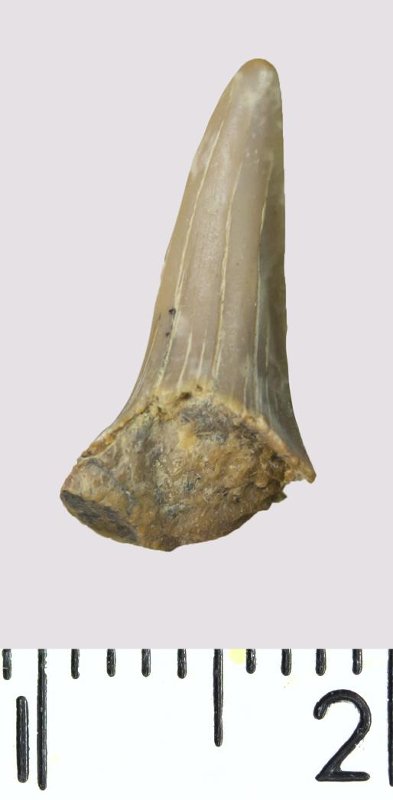 Зуб (фрагмент). Акула. Odontaspis macrorhiza (Cope) Leriche, 1902. Классификация: Хордовые Chordata, Позвоночные Vertebrata, Хрящевые рыбы Chondrichthyes, Пластиножаберные Elasmobranchii